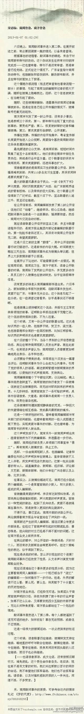 南周事件持续发酵,引大陆业界和社会广泛声援,并引发海内外强烈关注。1月7日凌晨,前《南方都市报》评论员宋志标微博发文《南周告急、南方告急》,称南周事件事态发展无法预测,已成为一场伟大的新闻运动。