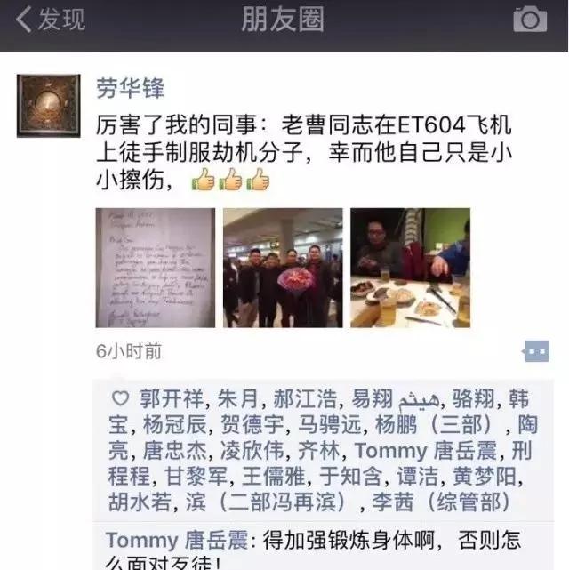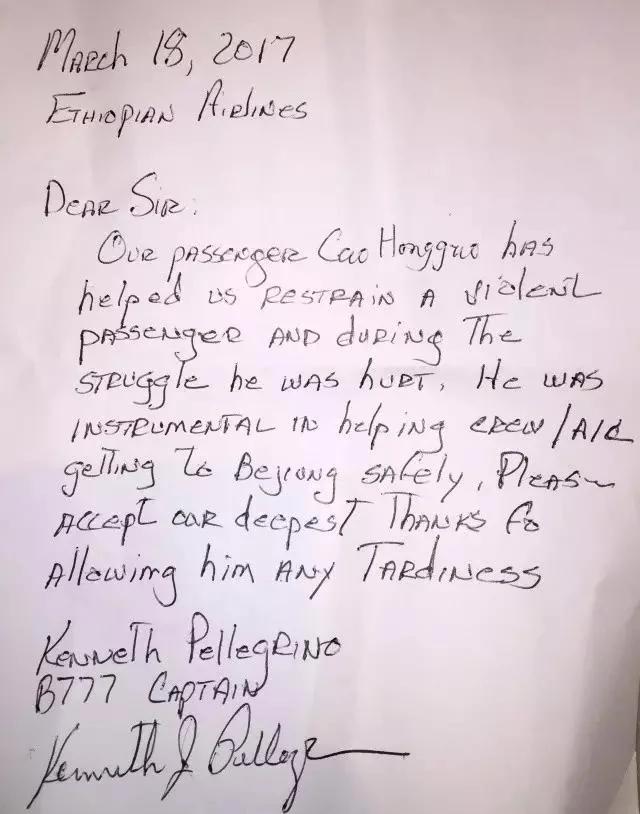 此时,曹红国心里的大石头落了地,恍然间才发觉脸上火辣辣的,原来在搏斗中他鼻梁和脸颊被擦伤了;头也隐隐作痛,不知道被歹徒手里大玻璃杯砸的,还是过程中撞的。正当挂了彩的他琢磨着怎么跟同事、家人解释、报平安时,处理完交接事务的埃航机长特意赶过来致谢,机长紧紧握着他的手,对他勇斗歹徒的义举表达万分敬意和感谢,并亲自写了一封感谢信。
