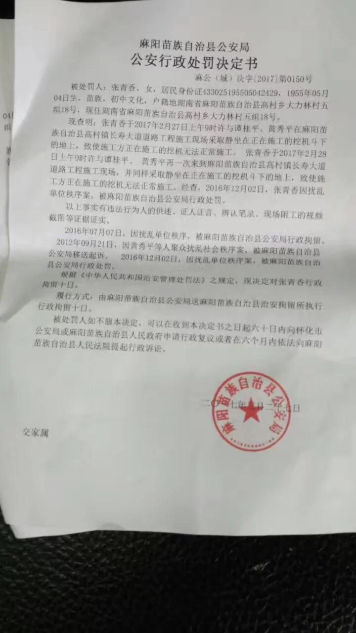 两天前,本台曾报道黄雨霞的母亲张青香因为阻止施工队施工,被当地警方带走,后被以“扰乱单位秩序”的名义行政拘留10天,并处罚款200元。