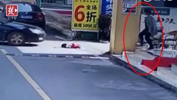 坐在店铺门口的女士可能是听到了女童的哭声,她站了起来,跑过去抱孩子,发现孩子居然爬了起来。