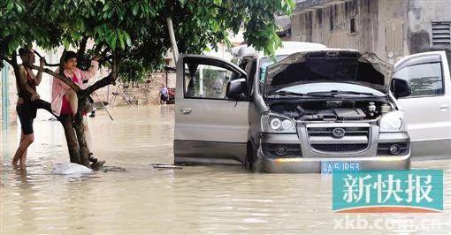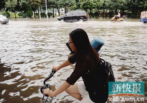 暴雨过后,白云区金沙洲彩滨北路段水淹严重,行人骑车小心而走。摄影宁彪孙毅