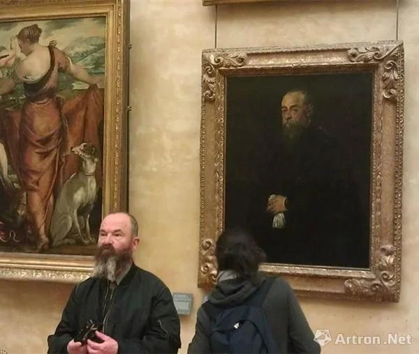 卢浮宫中似乎更容易碰见“故人”,男子身后是法国19世纪画家夏塞里奥的《多米尼克•拉克戴尔主教像》。还有打算去看《蒙娜丽莎》,反被展墙上“自己”所吸引的长胡子爷爷。