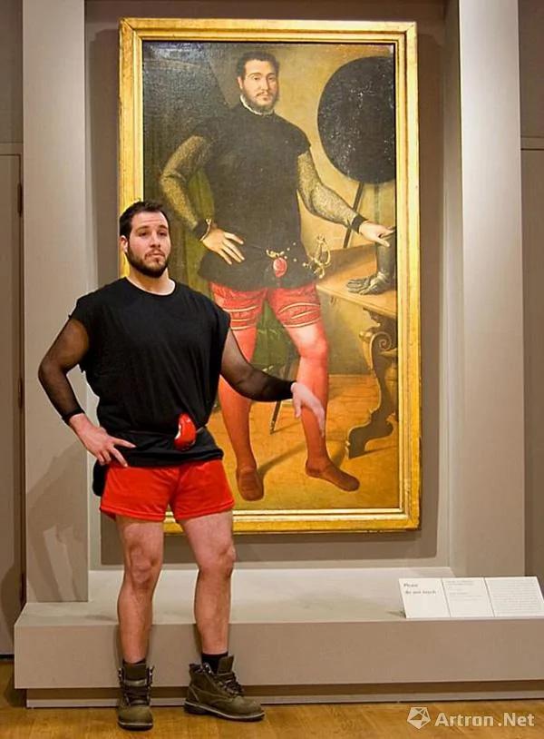 还有位网友也觉得自己与《拿着决斗长手套的贵族肖像》的人物相似,于是他“盛装打扮”前往拍照,红裤衩、丝网长袖、八字胡须、腰间别着红色鼠标?配上同样的动作表情,让人不得不想:画作中的红裤衩哪里买?