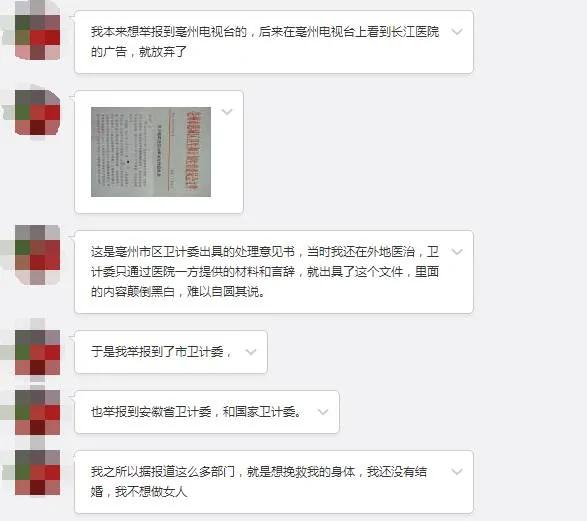 9月11日,亳州市谯城区卫生计生委受理了我的信访。不过在9月22日签发的处理意见书中,调查信息全部来自亳州长江医院提供的材料,没有征询我的说法,和事实并不相符。