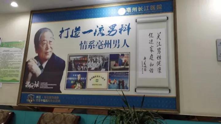 亳州长江医院二楼男科诊室外,挂着我国男科带头人郭应禄院士的照片和他们医院的广告语,而郭院士却不认识他们