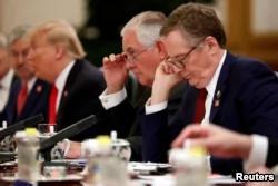 2017年11月9日,美国贸易代表罗伯特·莱特希泽(Robert Lighthizer,右)和美国国务卿雷克斯·蒂勒森(Rex Tillerson)出席了美国总统唐纳德·川普和中共国家主席习近平的双边会晤。