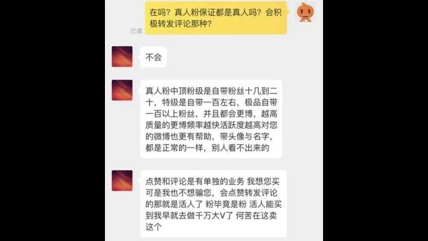 商家解释称:初级纷就是僵尸纷,也就是只显示数量那种,顶粉级是自带纷丝十几到二十,特级是自带一百左右,极品自带一百以上纷丝,并且都会更新微博,质量越高更博频率越快越活跃。