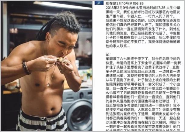 网传消息指,不幸在纳米比亚车祸中遇难的是“申俊”(右三)及“叶子”(右一)