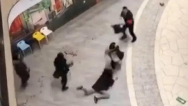 2018年2月11日,北京西城区的商场有人挥刀行凶,商场内的人走避,地上可见血渍。(网上视频截图)