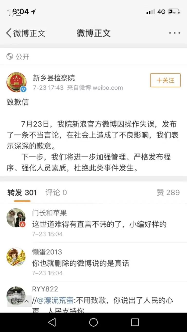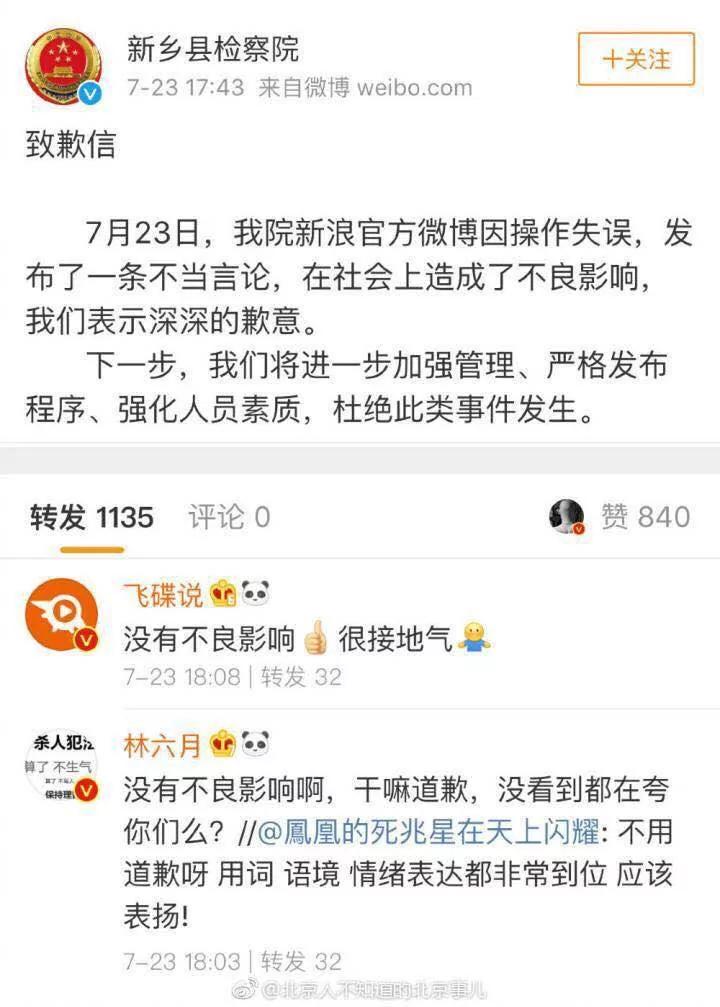 今日下午,新乡县检察院发布致歉信称,7月23日,其新浪官方微博因操作失误,发布了一条不当言论,在社会上造成了不良影响,表示深深的歉意。下一步,新乡县检察院将进一步加强管理、严格发布程序、强化人员素质,杜绝此类事件发生。