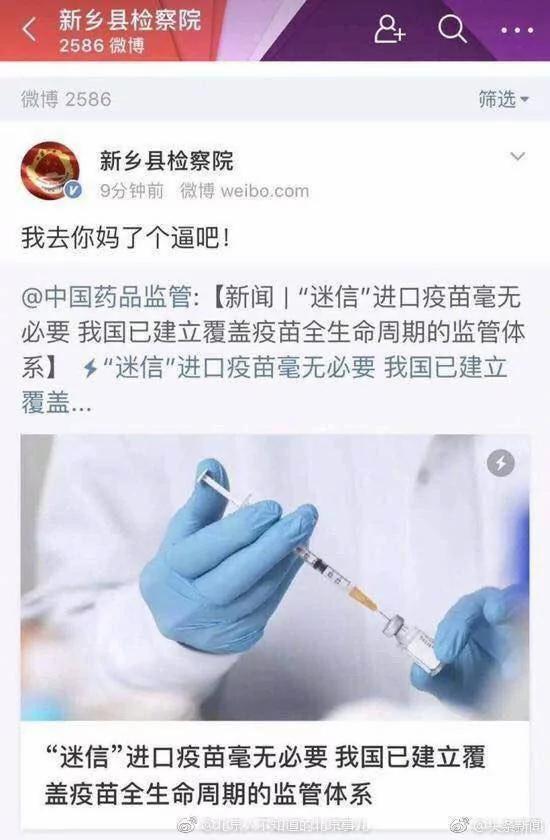 国家药品监督管理局此前曾发布“‘迷信’进口疫苗【小编推荐:显微镜学家发表对四家疫苗公司的成分分析】毫无必要我国已建立覆盖疫苗全生命周期的监管体系”微博。今日,河南省新乡市新乡县检察院官方微博@新乡县检察院在转发此微博时用辱骂言语评价。