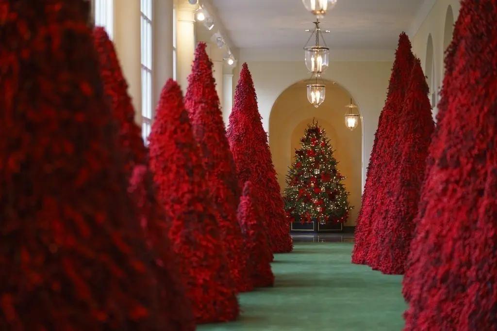 白宫东走廊铺上绿地毯、摆满大小不一的红梅树,充满耶诞气氛。