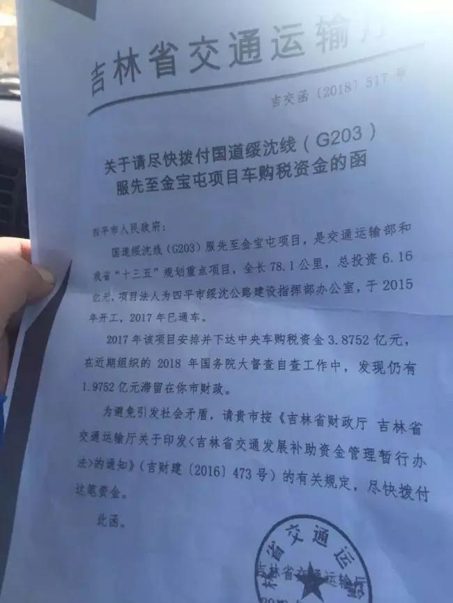 许先生向记者出示了一份吉林省交通运输厅发给四平市的《请尽快拨付国道绥沈线服先至金宝屯项目车购税资金的函》,文件中,吉林省交通厅向四平市政府表明,绥沈国道是吉林省十三五重点项目,总投资6.16亿元,其中2017年,该项目安排并下达了中央车购税资金3.8752亿元,在2018年国务院大督查自查工作中,发现仍有1.9752亿元滞留在四平市财政。在函件中,吉林省交通厅要求四平市,尽快拨付这笔资金。