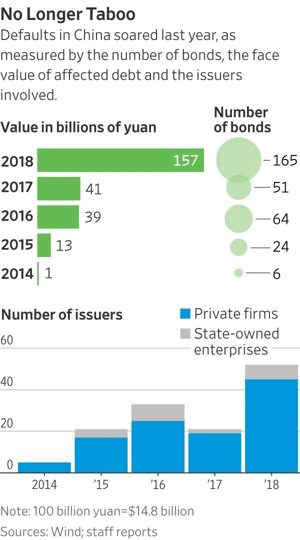 据Wind资讯提供的数据,去年有165只债券违约,总价值人民币1,572亿元(约合233亿美元)。这仅占整个公司债券市场的0.6%,但无论是违约债券数量还是规模都创下自2014年以来的最高水平。2014年,中国首次出现民营公司境内债券违约。