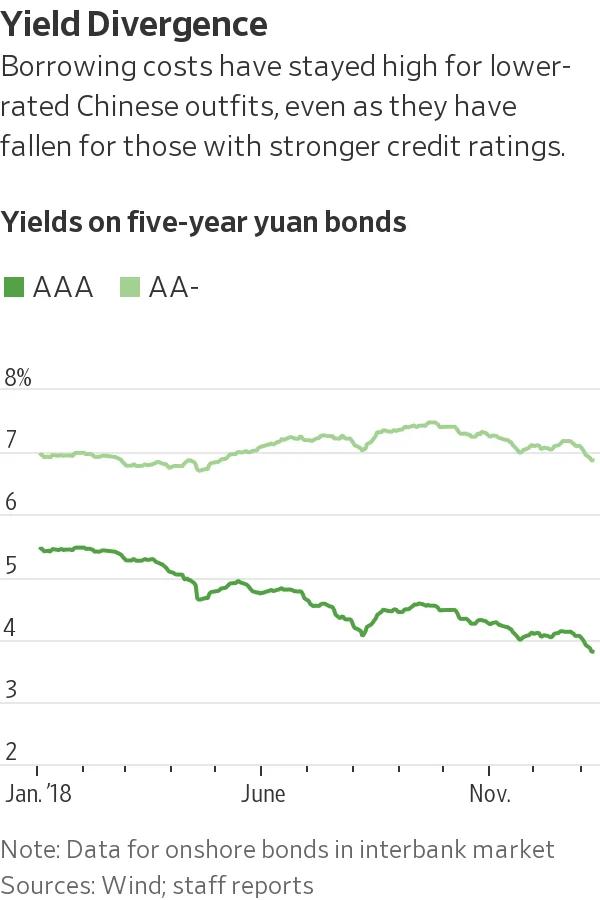 从实际情况看,多数评级较低的公司是民营企业,而评级较高的公司大多享有中央或地方政府的支持。投资者热衷购买国有实体发行的债券,包括那些财务状况可疑、仅一年前还接近破产的地方政府融资平台发行的债券。