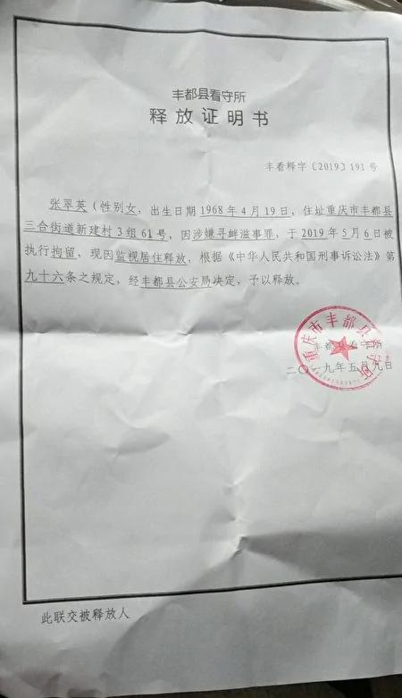 在丰都县看守所里,张翠英连续5天绝食抗议当局非法随意抓捕和关押,导致身体条件急剧恶化,5月9日丰都县公安局才放人,但要求必须随时汇报行踪,更不准离开重庆。