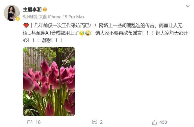 李湘则反应比较慢,直到她被释永信亲吻手背的AI合成视频在网络上发酵之后她才选择辟谣。