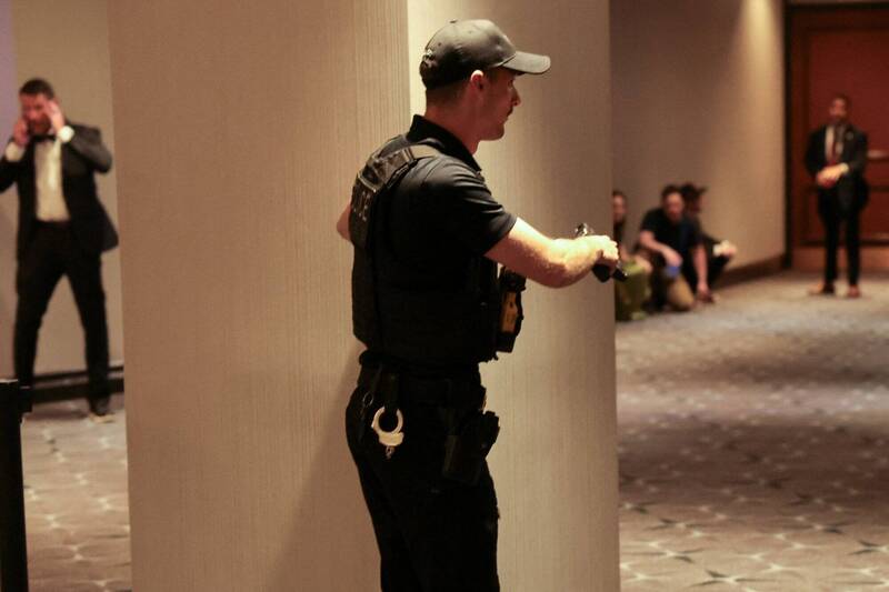 据美联社报道,事发时晚宴刚开始,与会者正在享用前菜沙拉。当服务人员准备上下一道菜时,多名维安人员突然冲入会场,高声命令所有人“趴下”。